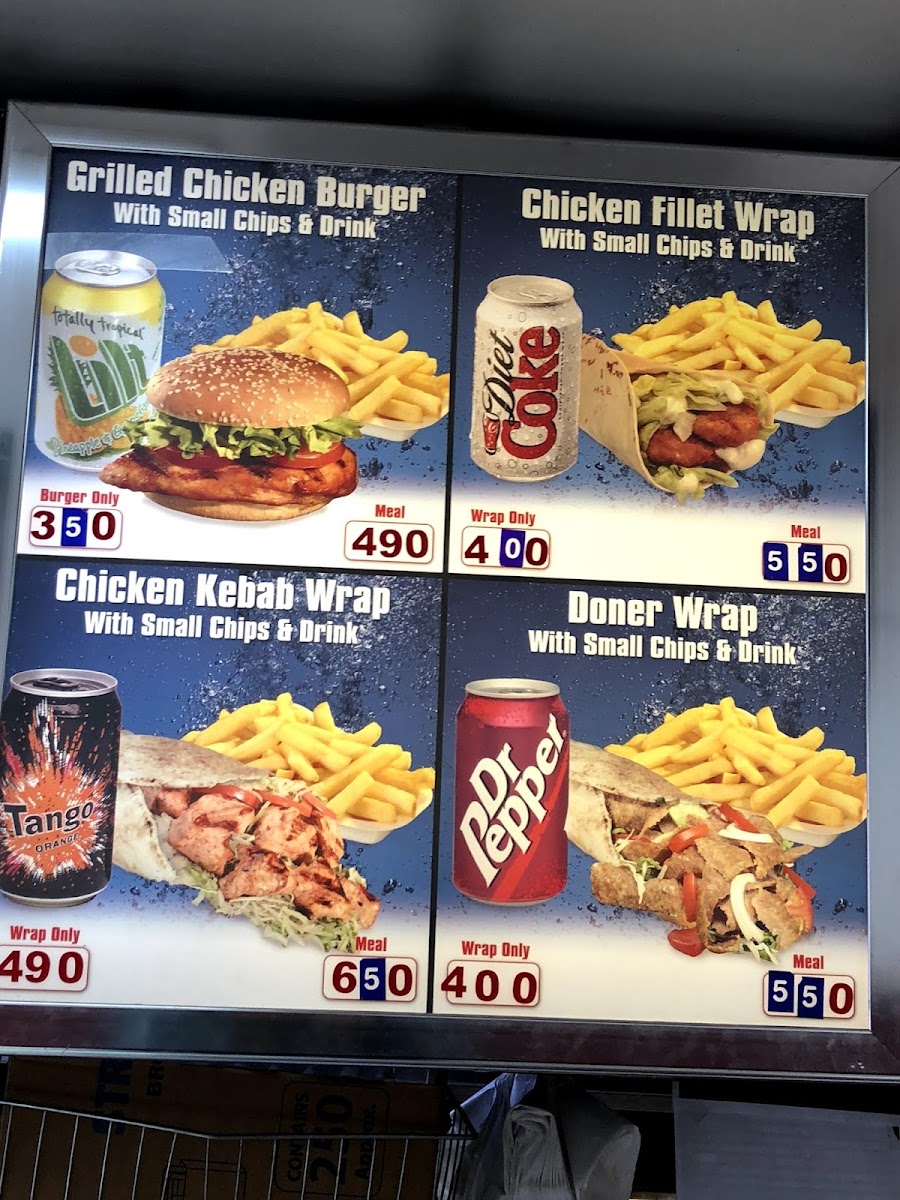 1x chicken fillet wrap, 1x Lamb doner wrap, 2x chicken fillets, 1x large chips and 1 bottle of drink